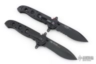 - Black coated serrated spear point blade made from stainless steel.