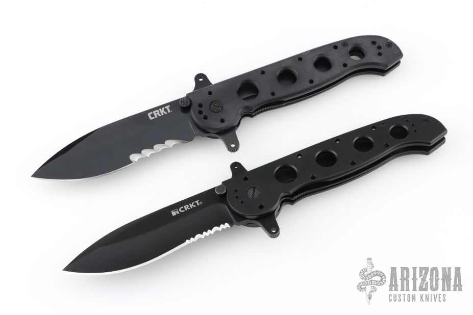 - Black coated serrated spear point blade made from stainless steel.