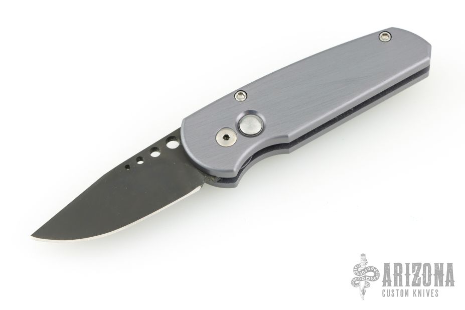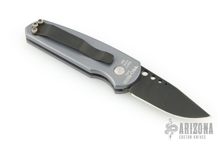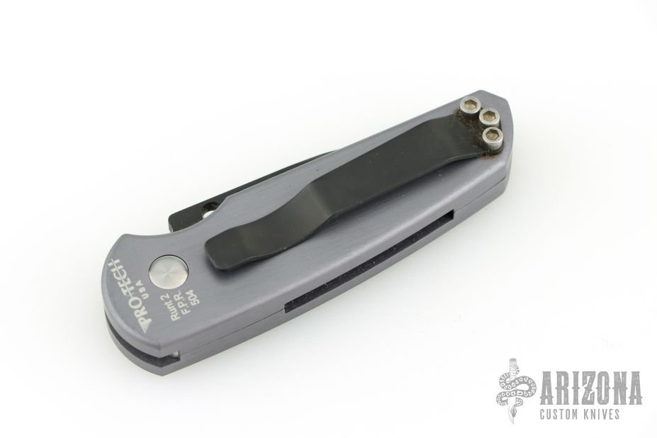 The Runt 2 has a California legal 1 15/16 inch clip point style blade and is slightly lighter and more compact than the original Runt. Super spring action. Pro-Tech quality. Special grey handle and black tip up clip. Comes with original box and papers. Has a couple light scuffs, excellent condition otherwise.