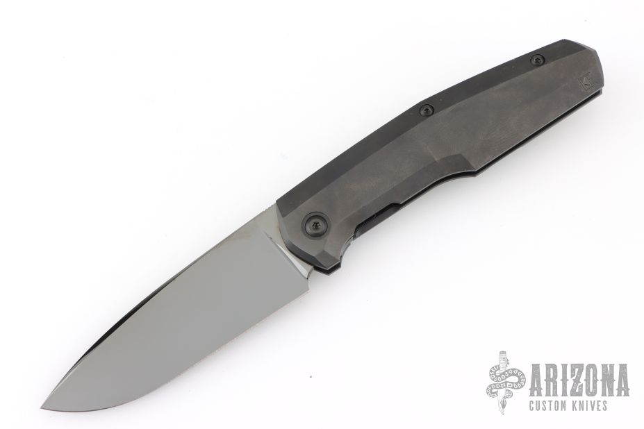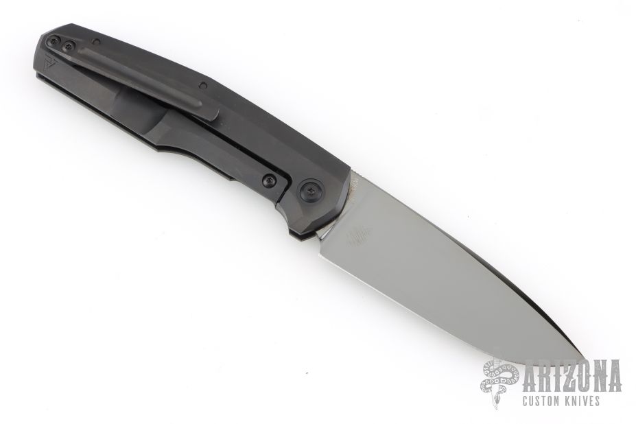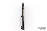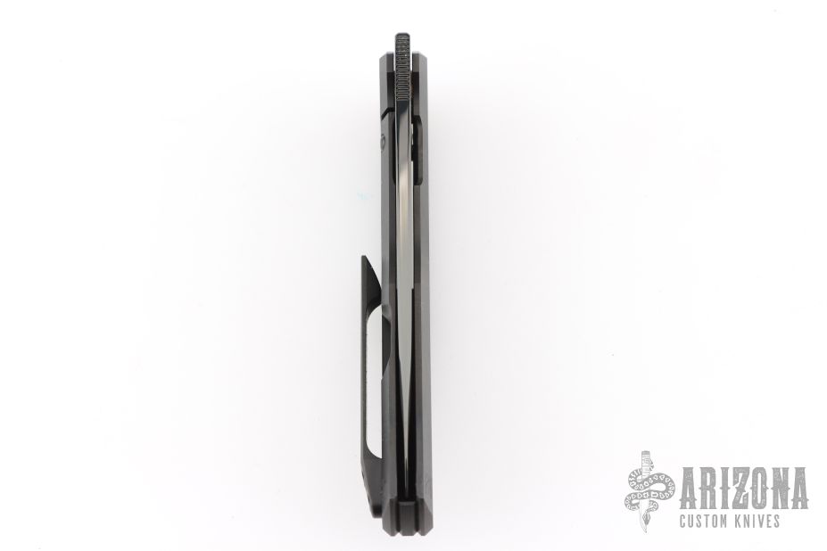 This framelock was designed by Philippe Jourget and manufactured by CKF. This knife features a mirror finished DLC drop point blade with a notched thumbrest. The handle has a DLC titanium frame with a matching backspacer and tip up pocket clip.  Includes a COA and a padded zippered case.  S/N 19. Dated 6/25.  Excellent Condition.