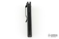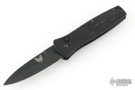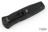This 3550 Mel Pardue designed side opening auto from Benchmade has a black spear point blade with a false top edge. Handle is matte black finished aluminum with milled contours, spine-thumb safety button, black stainless steel tip down clip, and lanyard hole. Comes with original box and pouch. Has some scuffs and scratches, great overall condition.