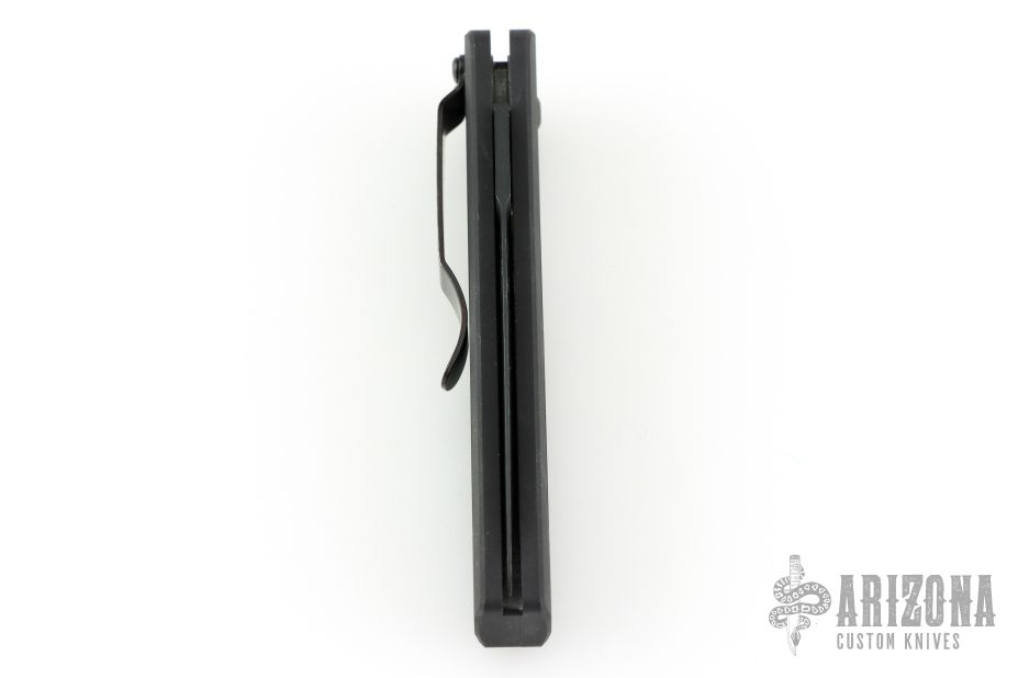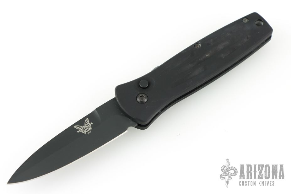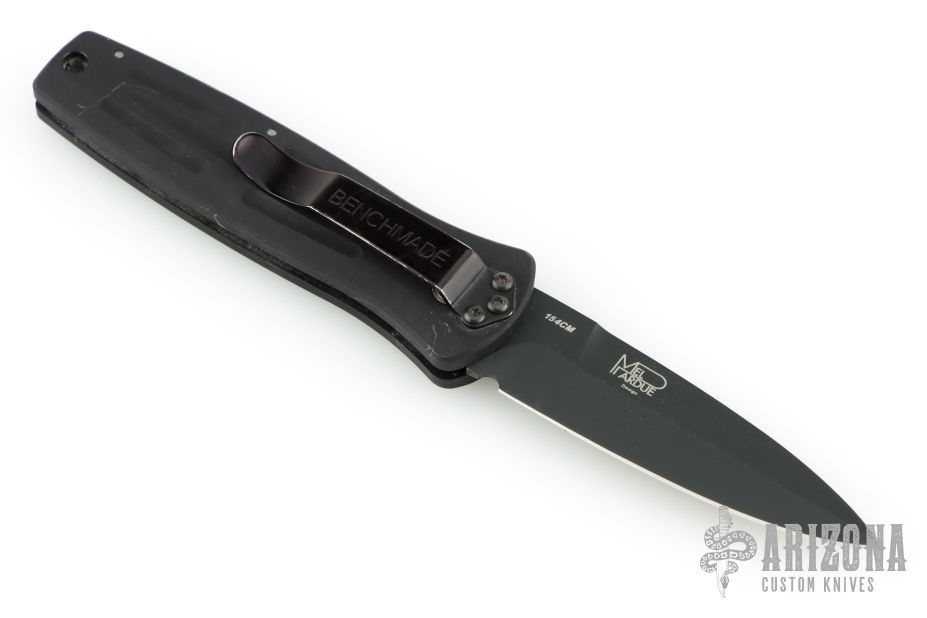 This 3550 Mel Pardue designed side opening auto from Benchmade has a black spear point blade with a false top edge. Handle is matte black finished aluminum with milled contours, spine-thumb safety button, black stainless steel tip down clip, and lanyard hole. Comes with original box and pouch. Has some scuffs and scratches, great overall condition.