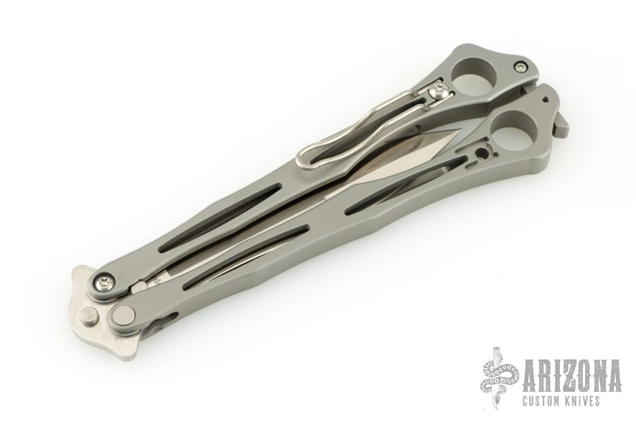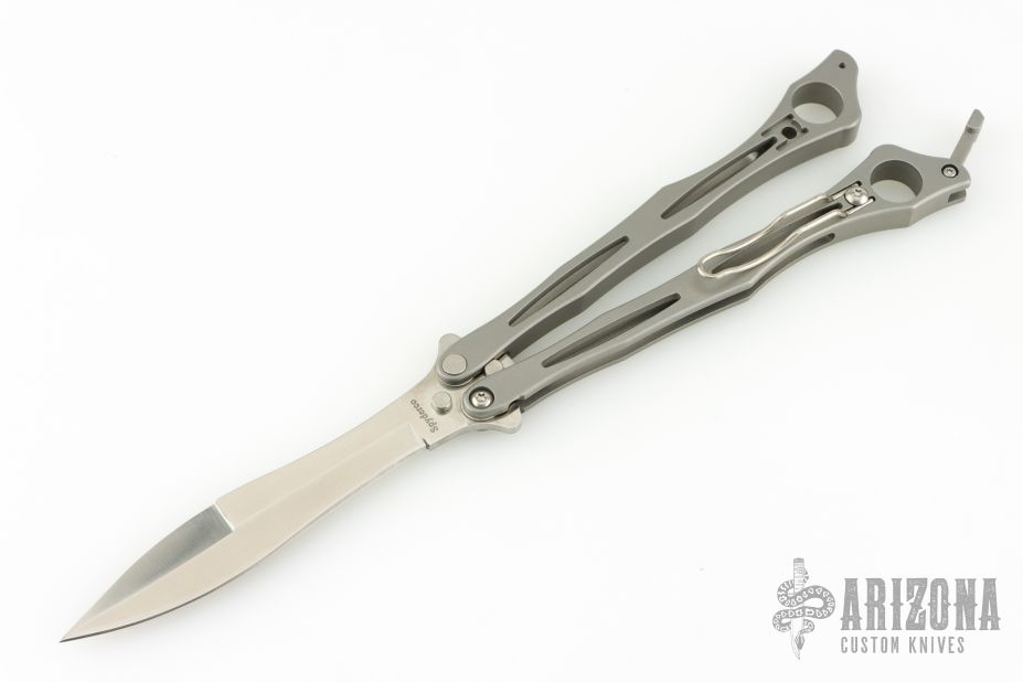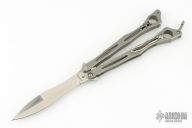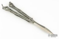 This Spyderfly Balisong by Spyderco features a satin finished spear point VG-10 blade with a false top edge. The handles are bead blasted stainless steel with a tip up clip (4-way reversible). Comes with original box and papers.  Excellent Condition.