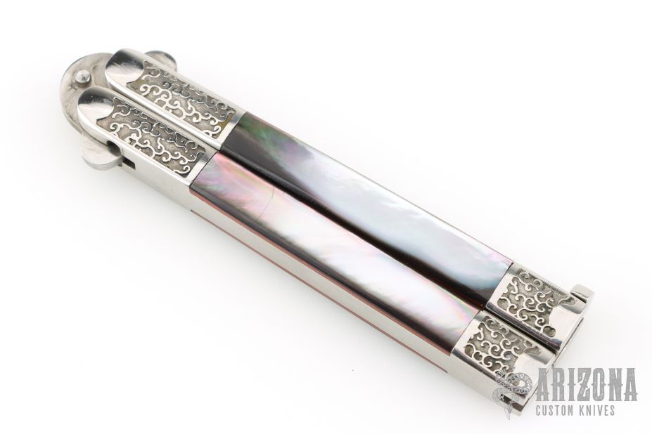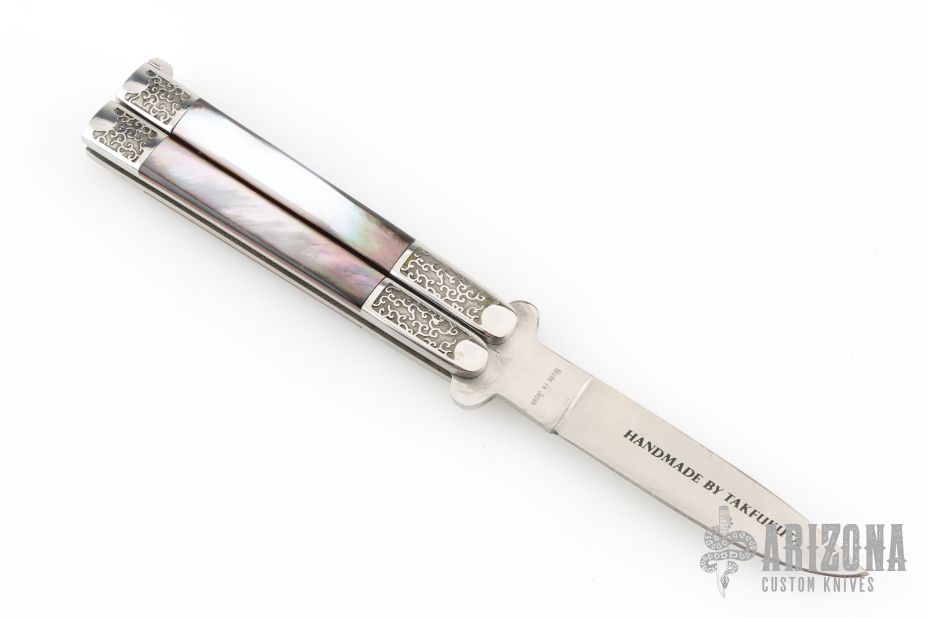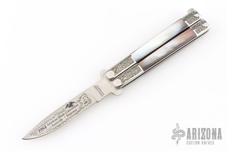 This Balisong by American Blade Chattanooga TN was handmade by TakFukuta. It is marked "1984 American Blade Convention, Knoxville Tennessee" and "1 of 600" on front of blade. Marked "Handmade by Takafuta" and "Made in Japan" on back. The handle has stainless steel handles with engraved bolsters and channel construction, black lip pearl inlays with red liners, t-latch at the butt. Nice lockup open and closed. Includes the original box. Excellent Condition.