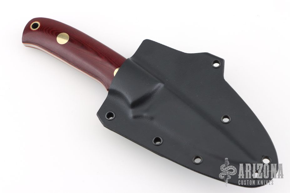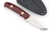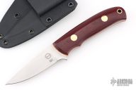 This K-33 Bird and Trout features a satin finished blade, .124" blade thickness and .840" blade depth, full tang construction. The handle has burgundy linen micarta scales with orange G-10 liners, brass pins and lanyard hole. Comes with a kydex sheath with belt clip. New from maker.