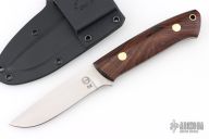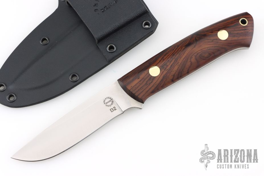 This K-22 Buffalo River Hunter by Dozier Knives features a satin finished blade, .131" blade stock and .907" blade depth, full tang construction. The handle has cocobolo scales with brass pins and lanyard hole. Comes with kydex sheath with belt clip. New from maker.