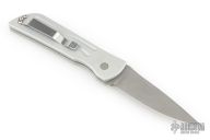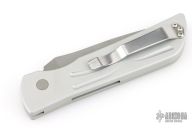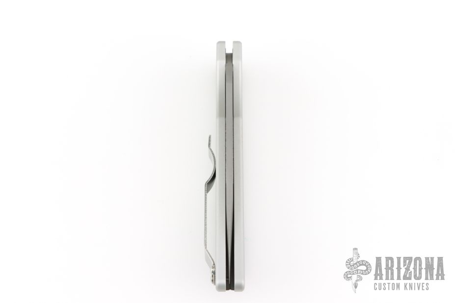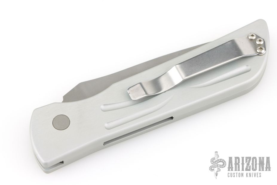 This side-opening automatic from WR Clark has a bead blast finished blade and a grey aluminum handle. Coil spring. Tip up stainless steel clip. Comes with original box. Has a couple light scuffs, otherwise Excellent condition.