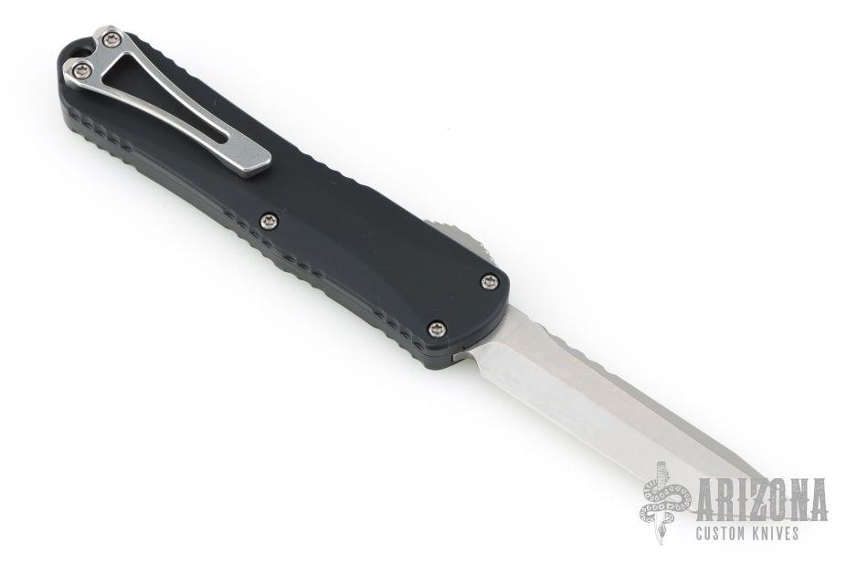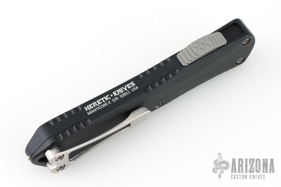 This Manticore-E by Heretic Knives features a stonewashed tanto blade with notched thumbrest. The handle has a black aluminum frame, stainless steel hardware and tip down clip. Comes with original box, card and lube. S/N 02811. Excellent Condition.