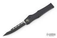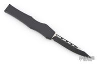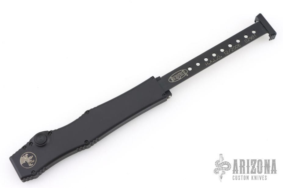 This HALO II is the clip point blade model in the HALO series by Microtech Knives. Single action, side positioned button for firing. Closure via a reverse charging handle in the rear of the frame. Contoured frame grip with milled ribbing on the frame spine and belly. This Halo II has a black clip point blade. Dated 12/2006 and #02901. Has a couple light scuffs, otherwise excellent condition for its age.