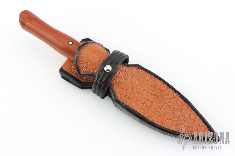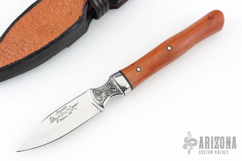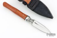 This Dagger by Ray Negron features a mirror polished double edged blade with .132" blade stock and 1.025" blade depth, hidden tang construction. The the handle has engraved 304 stainless steel bolsters, stainless steel collar, pink ivory wood grip with stainless steel pins. Comes wit a hand tooled two-tone leather sheath. Has a stabilized crack on the handle, (it came this way from the maker) otherwise excellent condition.