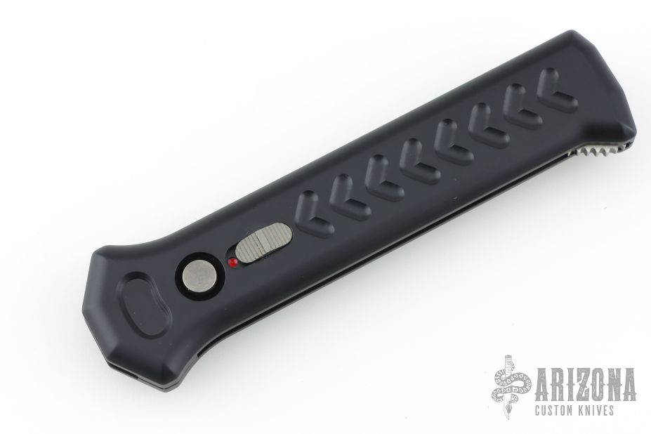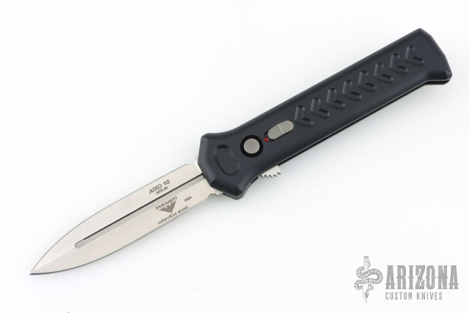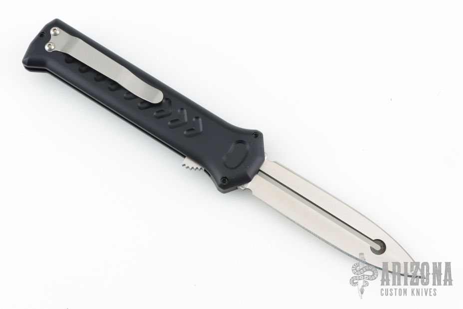 The blade is satin finished and double edged. The handle is milled aluminum with a black stainless steel pocket clip, tip down carry. The push button fires the blade and when open, allows you to retract the blade. Sliding safety. Comes with original box and card. Has a couple light marks, excellent condition.