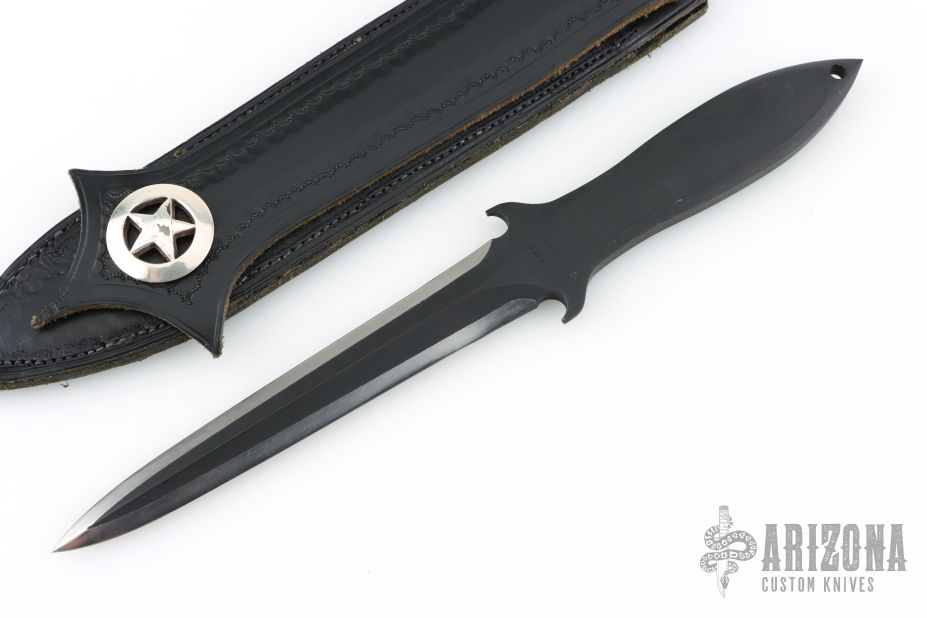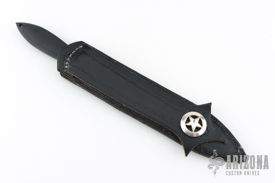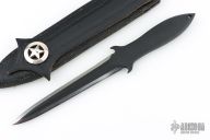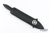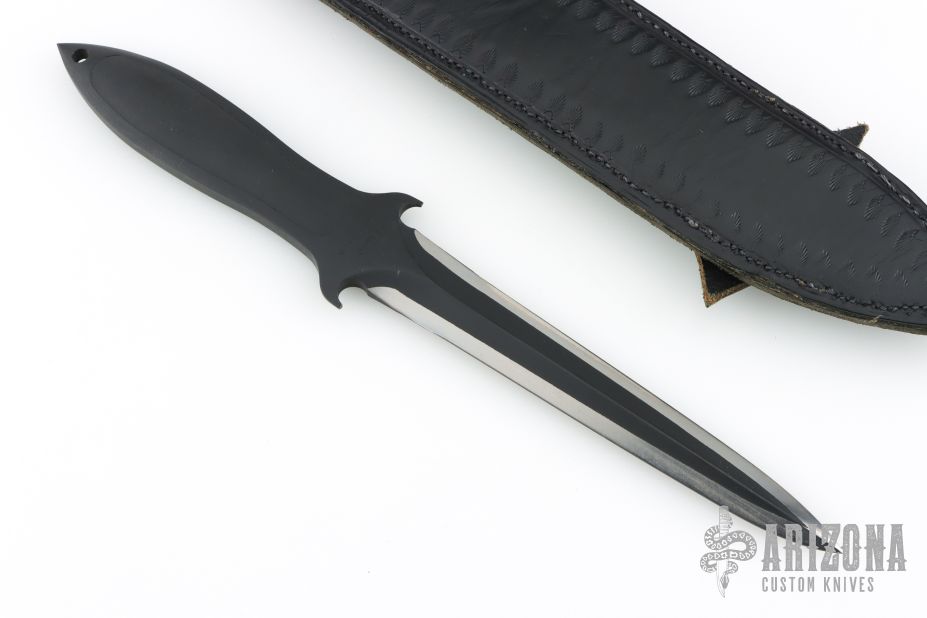This Rambo The Mission Dagger by Jimmy Lile is a pretty rare bird! It features a two-tone double edged blade with .355" blade stock and .887" blade depth, integral construction with black linen micarta inlay(s). Comes with a custom hand tooled black leather boot sheath and zippered case. Has some light scuffs, otherwise excellent condition. #065 Don't let this one slip away.