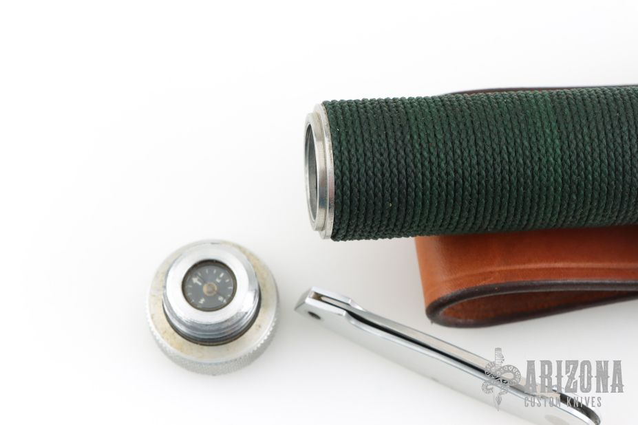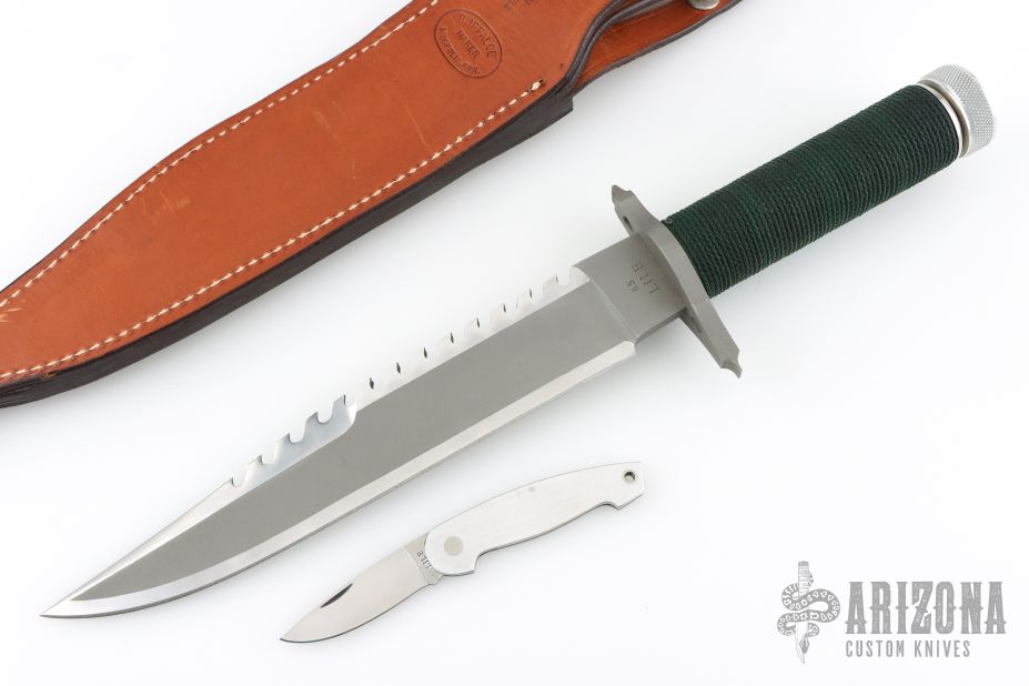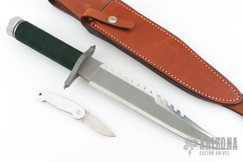 This Rambo First Blood Knife from Jimmy Lile features a two tone blade with Titanium Grey Cerakote center and satin grinds, sharpened top edge and 12 saw-teeth on blade spine, .243" blade stock and 1.495" blade depth, hidden tang construction. The handle has a Titanium Grey Cerakote stainless steel double guard with flat and Phillips head screw drivers, hollow cord wrapped handle, and aluminum removable butt cap with an O-ring to make it water-proof. Comes with brown leather sheath that has a honing stone in the sheath. The knife has a few light scuffs, otherwise excellent condition. This knife is part of a limited run of 100 made by Jimmy Lile.