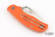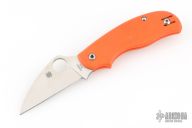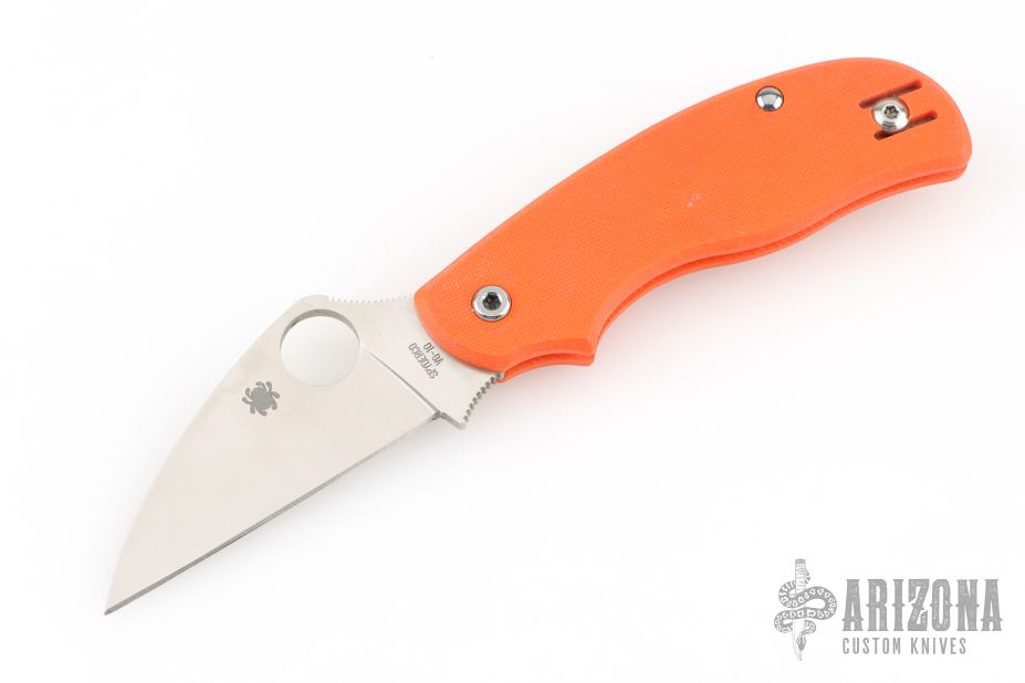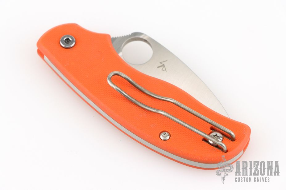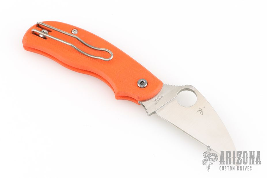 This Urban knife by Spyderco features a satin finished wharncliffe blade with thumbhole and notched thumbrest. The handle has orange G-10 scales with a reversible tip up clip.  Comes with original box and papers. Discontinued.  Excellent condition.