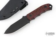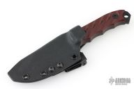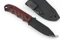 This Disaster Cub by Half Face Blades features a black blade with a notched thumbrest, .170" blade stock, 1.092" blade depth, full tang construction. The handle has contoured red/black G-10 scales, lanyard hole at the butt. Comes with original box, papers and kydex sheath. Excellent condition.