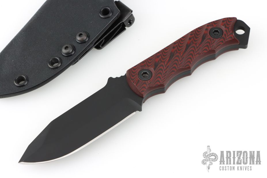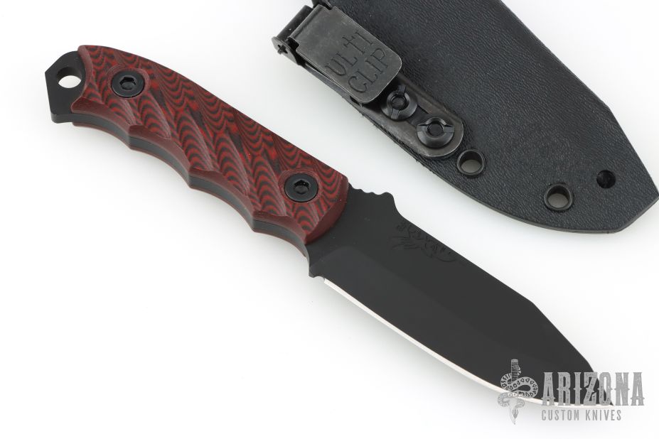This Disaster Cub by Half Face Blades features a black blade with a notched thumbrest, .170" blade stock, 1.092" blade depth, full tang construction. The handle has contoured red/black G-10 scales, lanyard hole at the butt. Comes with original box, papers and kydex sheath. Excellent condition.