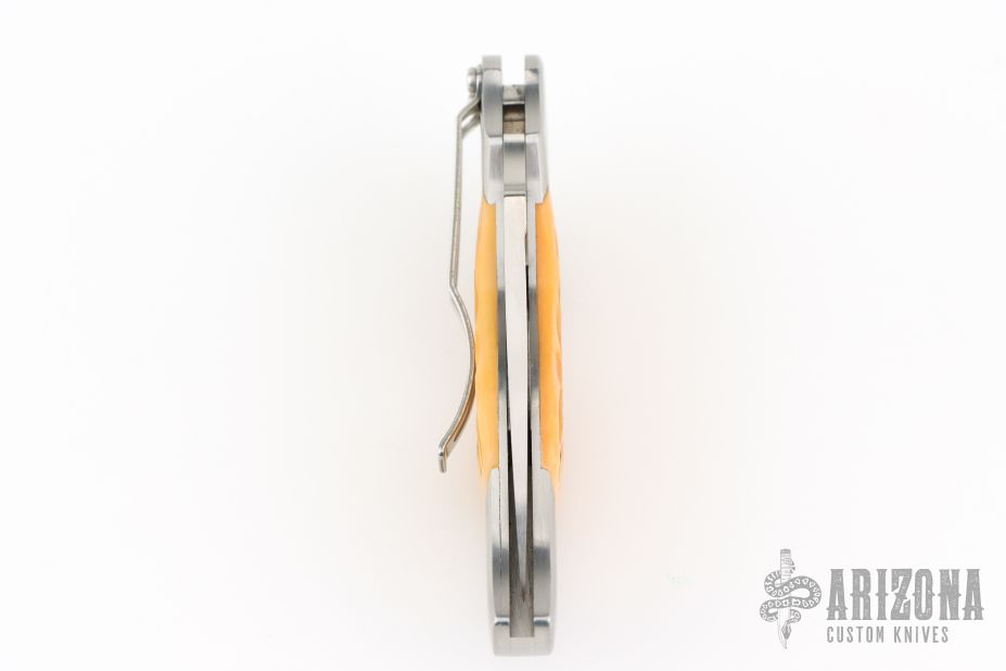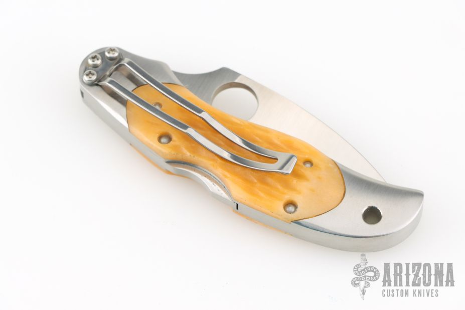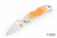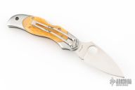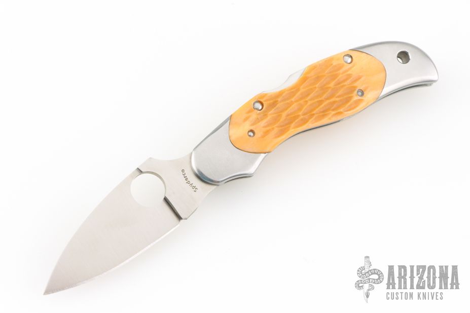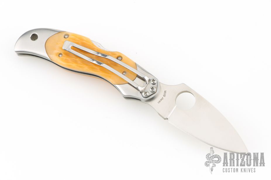 This lock back folding knife by Spyderco features a satin finish VG10 blade, and stainless steel double bolsters. Nice squash colored jigged bone scales. Stainless steel clip. Includes original box and COA dated May 2009. One of 600. Has a couple light scuffs, excellent condition otherwise.
