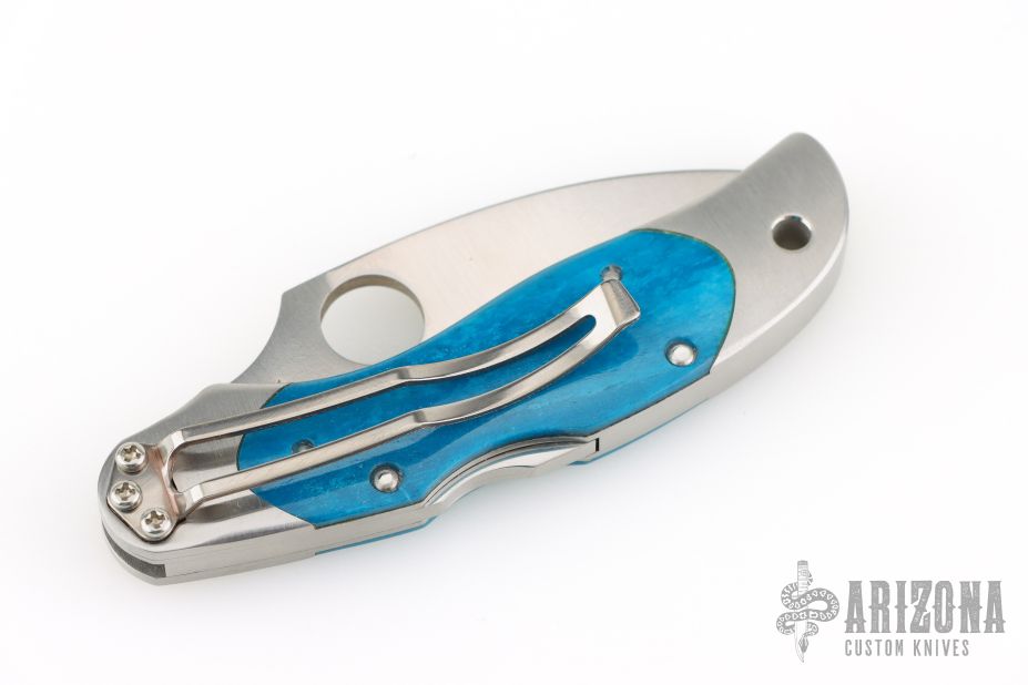 This Kopa by Spyderco features a satin finish VG10 blade with thumb hole. The handle has a stainless steel double bolsters and dyed bone scales over stainless steel liners and backspacer. Stainless steel tip down clip and lanyard hole in pommel. Includes original box.Limited Edition.  1 of 600.  Has a couple light scratches, otherwise excellent condition.