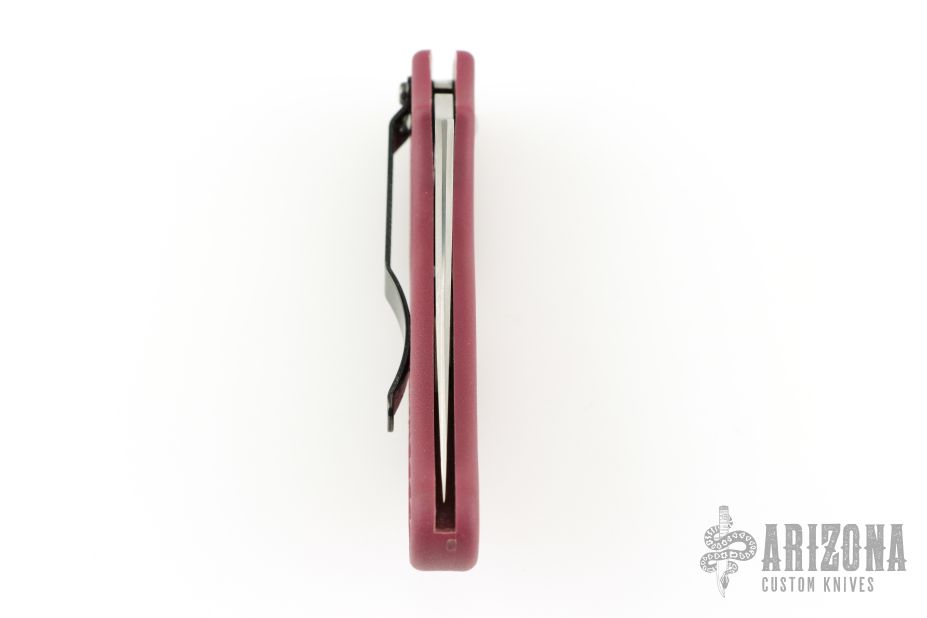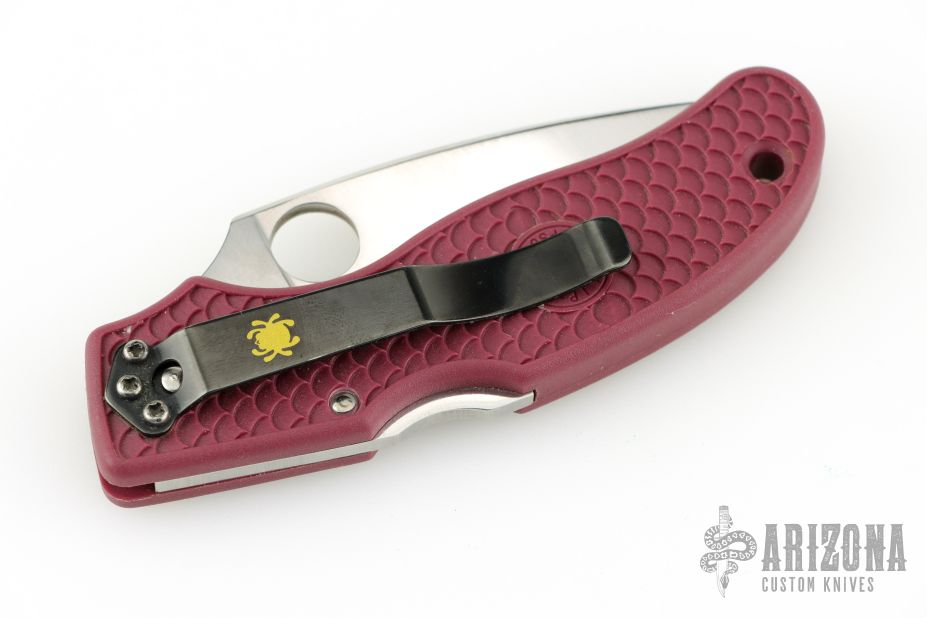 Spyderco persistently pushes the envelope searching for, and testing higher performance blade steels. ZDP-189 is our latest offering and is rapidly asserting itself as an up-and-coming steel. ZDP-189 steel is a Japanese manufactured powdered metal with phenomenal chemistry and 3% carbon. As a result, ZDP-189's hardness measures high on the Rockwell scale and its edge retention is exceptional. The C52PBRG Calypso Jr.'s blade has a thin layer of ZDP-189 steel sandwiched between two layers of 420J2. Layering provides the flexibility and sharpening ease associated with 420J2 while the ZDP-189 layer brings the benefits of exotic high carbon steel. The Calypso Jr. comes with a FRN burgundy handle that is Bi-Directionally Textured™ into a multi-level fish scale pattern, enhancing "grip without slip". The clothing clip is embellished with a gold Spyderco bug logo and attaches with three screws to either side of the handle for right- and left-handers. Limited piece run, available for a short time. PlainEdge blade only.