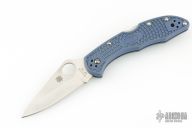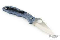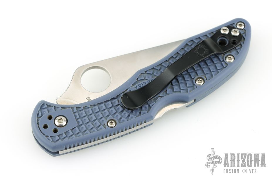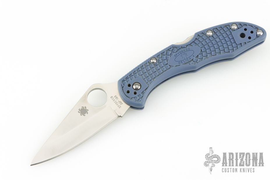 Spyderco's Delica has been a cornerstone of their everyday carry product line since its introduction in 1990. The 4th Generation of the Delica lightweight was upgraded with a 13 mm RoundHole, spine jimping, reinforced blade tip, skeletonized liners, Bi-Directional Textured FRN scales and a four-position screw on clip. This version comes with a plain edge, modified drop point blade of premium, Japanese ZDP-189 carbon steel and Blue FRN handles.