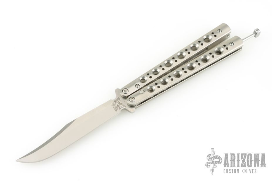 This Model 63 Balisong by Benchmade features a clip point blade with swedge. The handle has a skeletonized stainless steel construction over steel spacers, t-latch. Comes with original box and nylon sheath. Has two small dings on one of the handles, otherwise excellent condition.