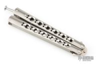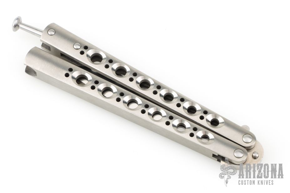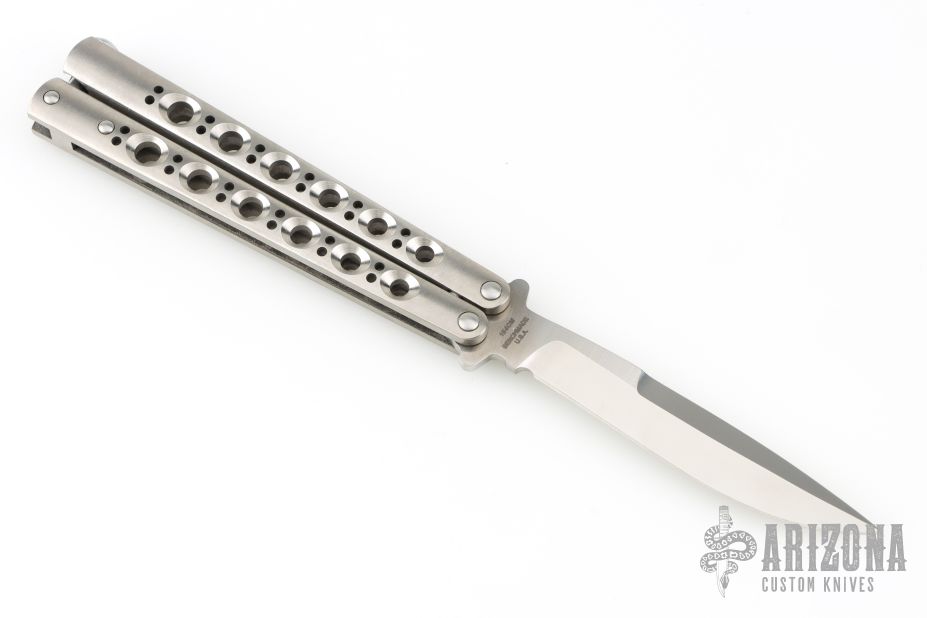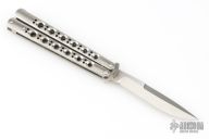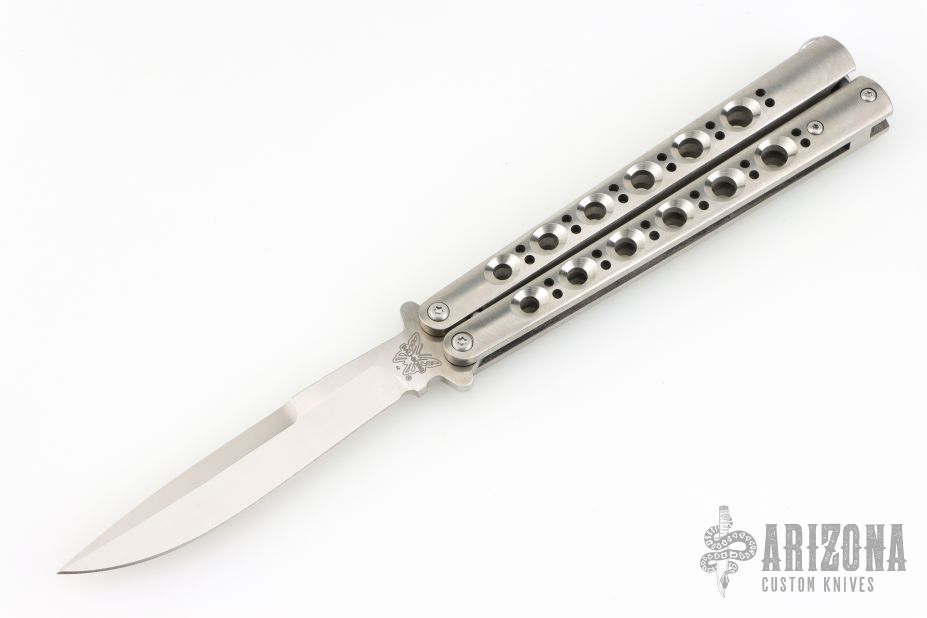 This Model 42 Balisong by Benchmade features a satin finished blade with swedge. The handle has an integral skeletonized titanium handles with spring latch on pommel. Includes original box, papers and nylon sheath. Excellent condition.