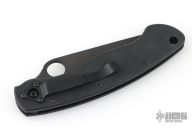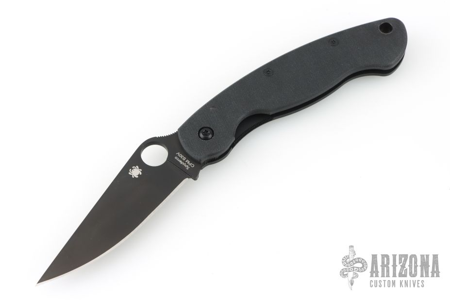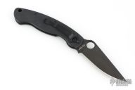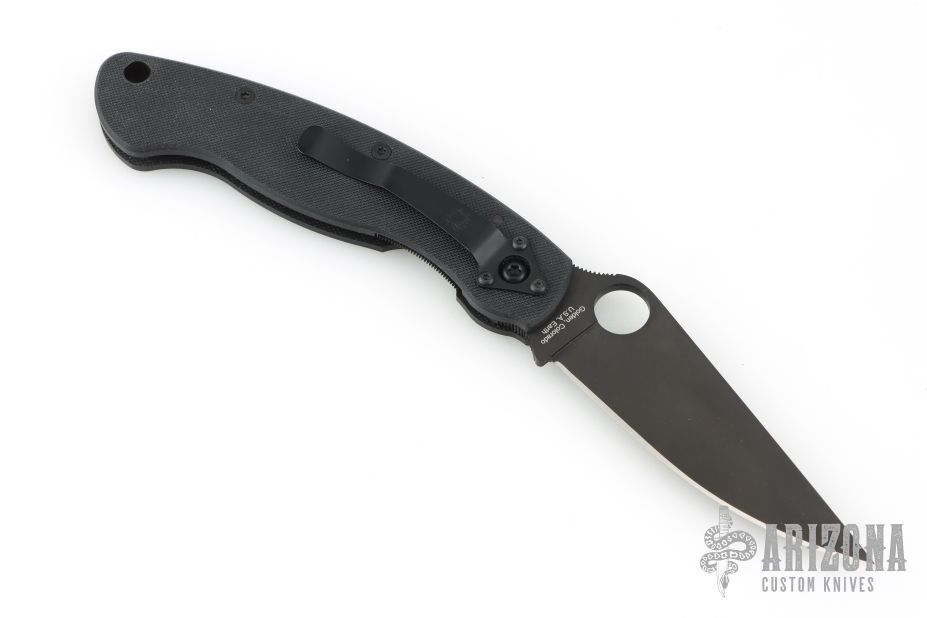 This Military Liner Lock by Spyderco has a black finished CPM S30V stainless steel clip point blade with notched thumb rest and thumb hole. Handle is black G10, with stainless steel single liner (lock), black fiber back spacer, black stainless steel tip down clip, and lanyard tube pin. Comes with original box and papers. Has a couple light scuffs on the handle, excellent condition.