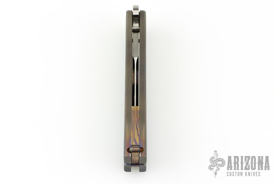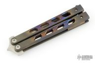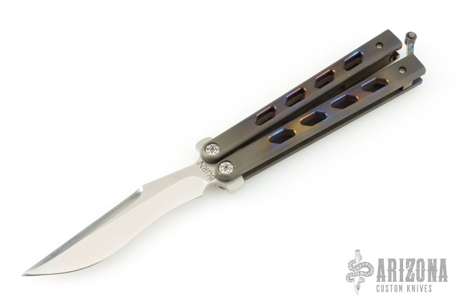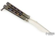 This Prototype Model 3 Balisong by Burn Knives features a satin finished blade with a false top edge. The handles are anodized titanium with MokuTi spacers and T-latch. Has a couple light scuffs, excellent condition otherwise.