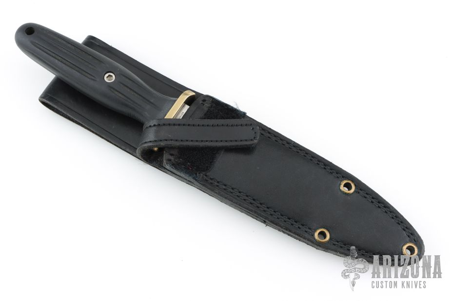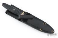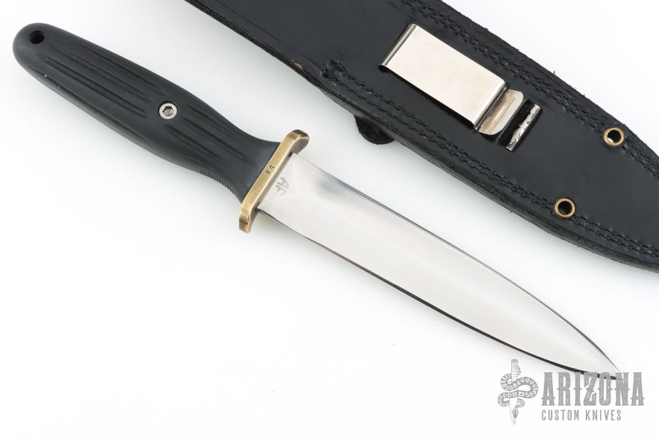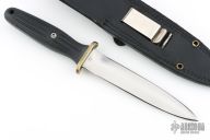 This Applegate Fairbairn Fighting Knife was made by TJ Yancey. It has a hand rub satin finished double edged blade (circa 1980) with hidden tang. 3/16" blade stock, 1-1/8" depth. Handle is black non-slip polymer with lanyard hole, and brass double guard (stamped "58"). For a 40 year-old piece, this knife is in excellent shape. Comes with original black leather sheath. Only 331 made with the black polymer handle. Has a couple very light scratches, otherwise excellent condition.