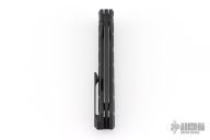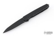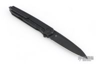 This Cypher Mini Dark by Deryk Munroe features a dark acid/tumble finished blade with fullers, a notched thumbrest and flipper. The handle has a dark acid/tumbled titanium frame, a matching titanium backspacer with lanyard hole, titanium tip up clip with hidden screws, and stainless steel lockface insert/internal over travel stop. Nice detent, lockup and blade seating. Rides on caged ceramic Si3N4 bearings. Comes with original packaging, and an extra set of washers. Excellent condition.