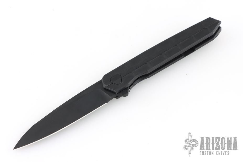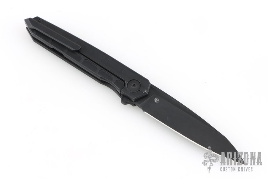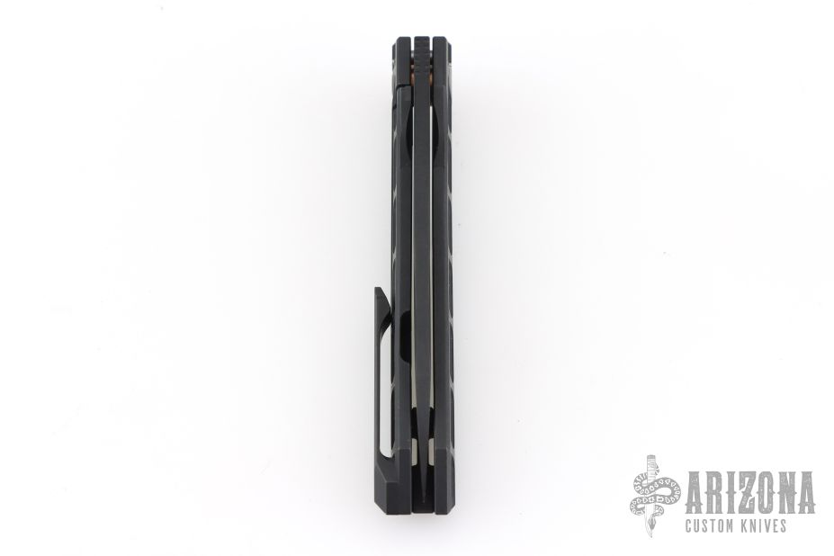 This Cypher Mini Dark by Deryk Munroe features a dark acid/tumble finished blade with fullers, a notched thumbrest and flipper. The handle has a dark acid/tumbled titanium frame, a matching titanium backspacer with lanyard hole, titanium tip up clip with hidden screws, and stainless steel lockface insert/internal over travel stop. Nice detent, lockup and blade seating. Rides on caged ceramic Si3N4 bearings. Comes with original packaging, and an extra set of washers. Excellent condition.