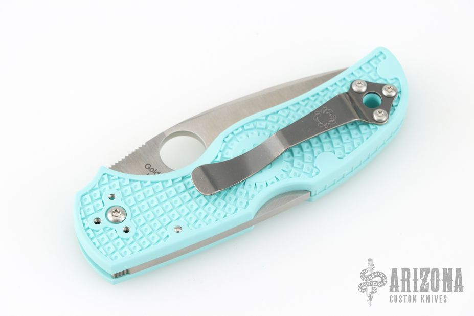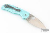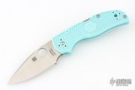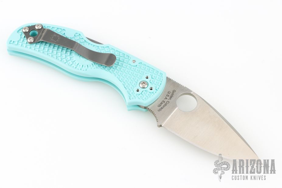 This Native 5 by Spyderco has a plain edged satin finished blade and teal FRN handle with a stainless clip. Comes with original box and papers. New condition.