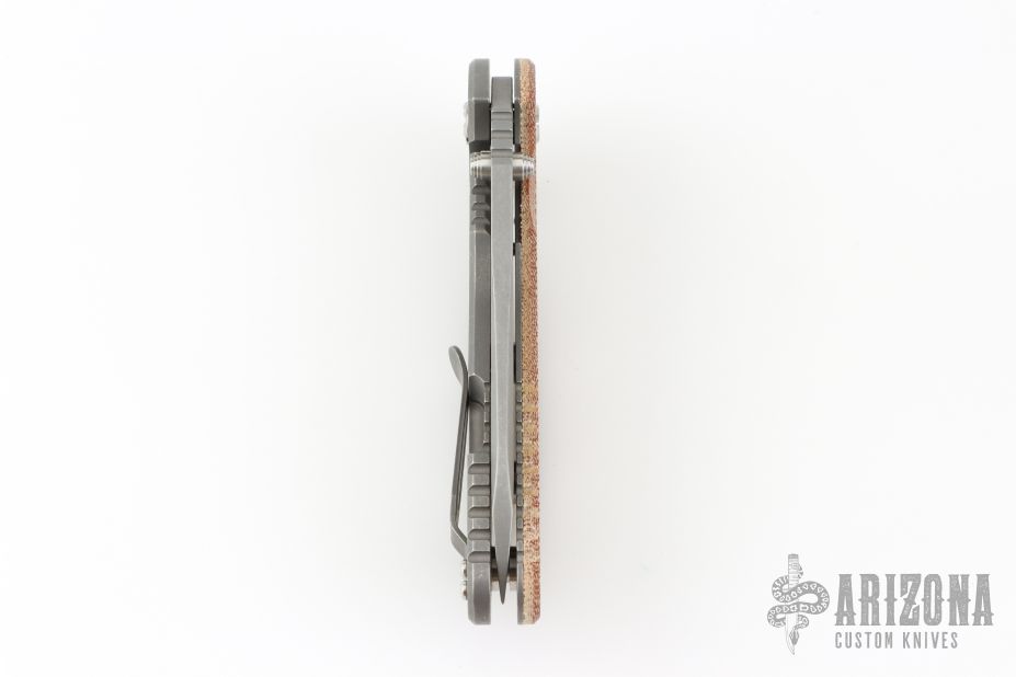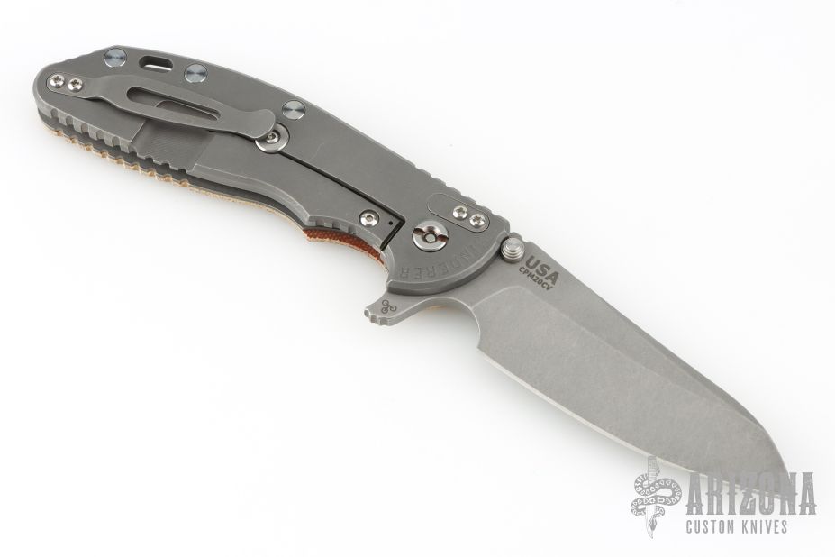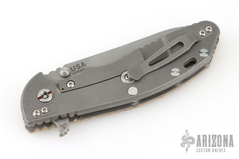 This Bowie Ground XM-24 from Hinderer Knives features a working finished blade with dual thumbstuds and notched thumbrest and flipper. The handle has a micarta cover, textured working finished titanium frame over satin finished barrel spacers, hardware and filler tab and pocket clip, lockbar stabilizer. Includes original box, card, and extra washers. Excellent condition.