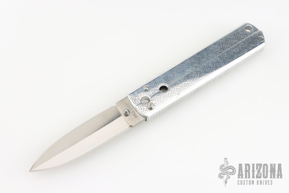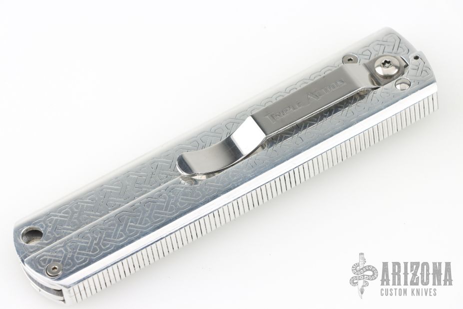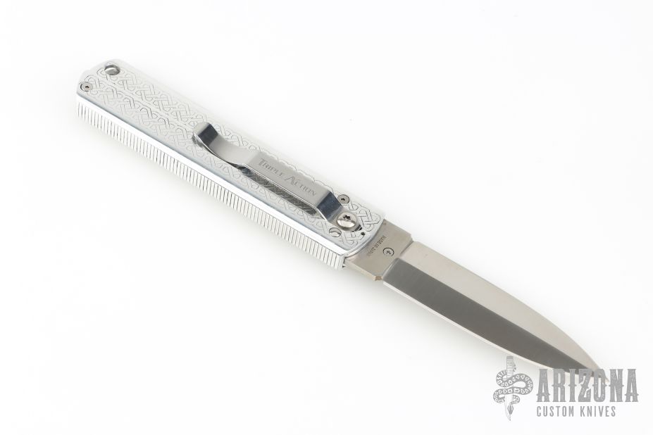 This Triple Action by Cold Steel features a double edged blade with single thumbstud. The handle has an aluminum frame that houses the blade. Has a tip down pocket clip. Comes in a DLT wrap. Has some scratches, otherwise excellent condition.