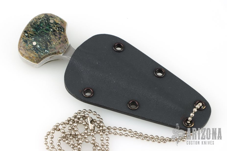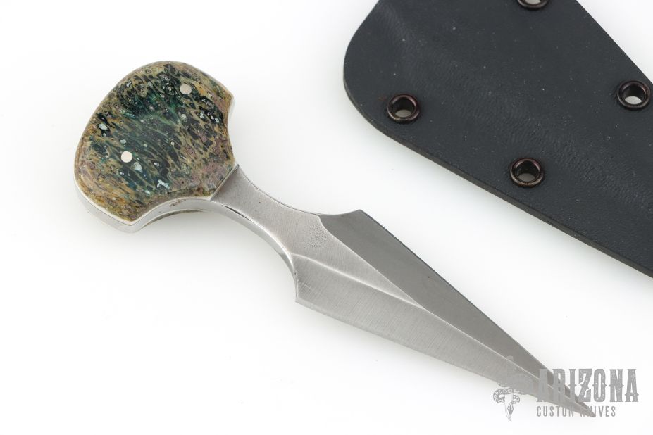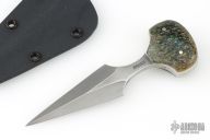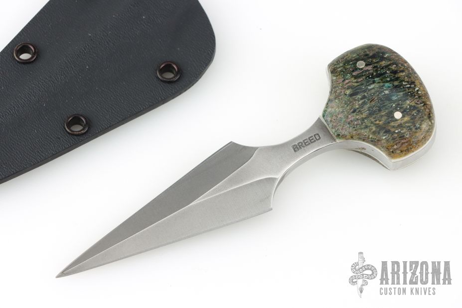This knife by Kim Breed features a dagger style blade with a pinned handle. .162" Blade Stock. .952" Blade Depth. Includes a kydex sheath and chain. Has a couple light scuffs, otherwise Excellent Condition.