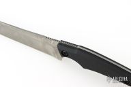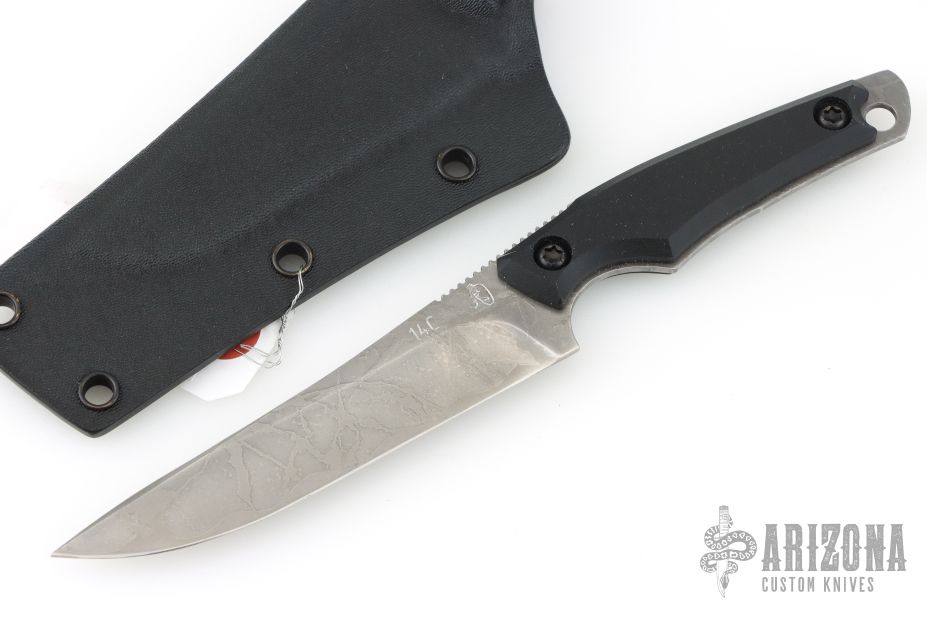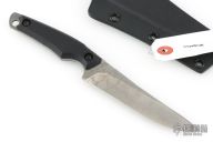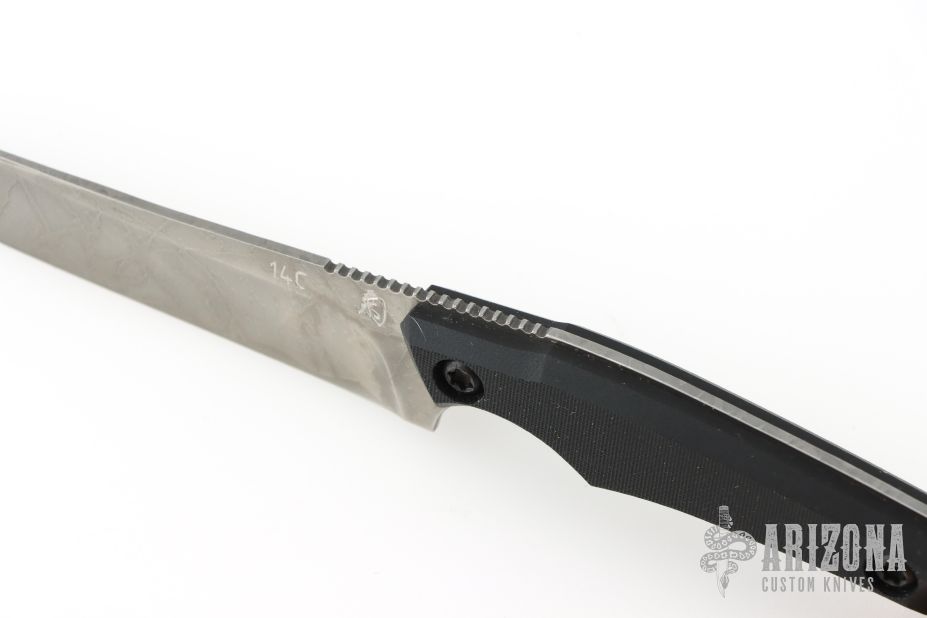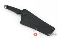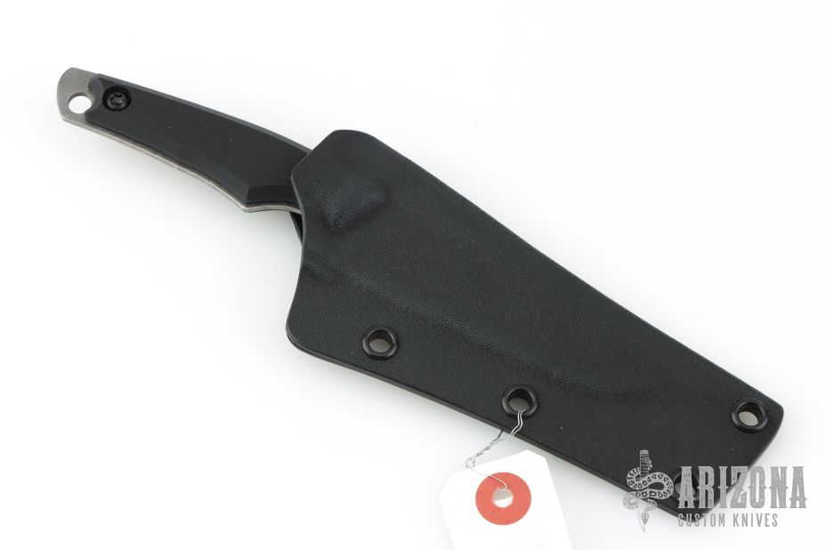 This knife by Kiku Matsuda features a clip point blade with a false top-edge, notched thumb rest, and full tang construction. .076" Blade Stock. 1.023" blade depth. The handle features black G-10 Scales.  Includes a black kydex sheath, papers, clip, and extra hardware. New condition.
