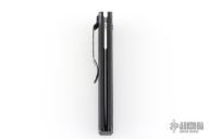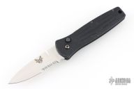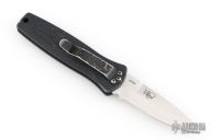 This 3550 Mel Pardue designed side opening auto from Benchmade has a satin finished spear point partially serrated blade with a false top edge. Handle is matte black finished aluminum with milled contours, spine-thumb safety button, black stainless steel tip down clip, and lanyard hole. Has scuffs and scratches throughout. Fair condition otherwise.