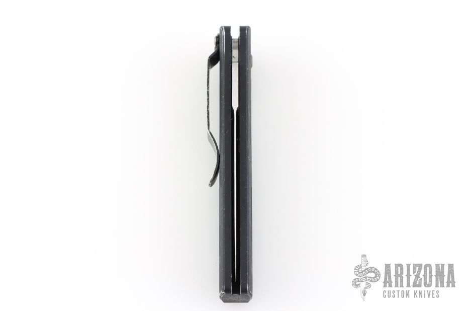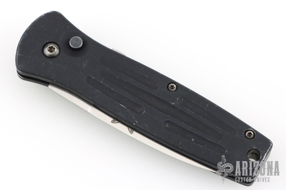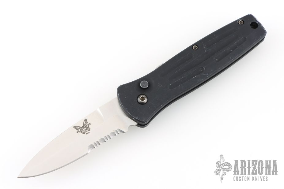 This 3550 Mel Pardue designed side opening auto from Benchmade has a satin finished spear point partially serrated blade with a false top edge. Handle is matte black finished aluminum with milled contours, spine-thumb safety button, black stainless steel tip down clip, and lanyard hole. Has scuffs and scratches throughout. Fair condition otherwise.