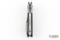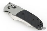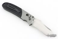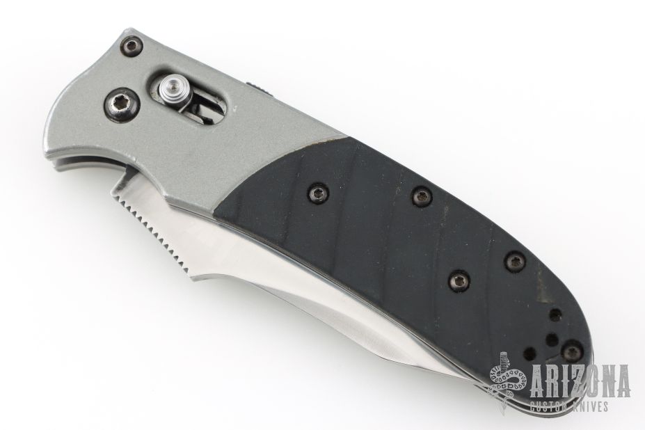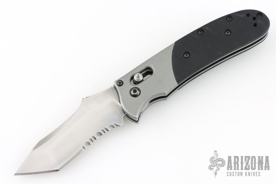 This knife by Heckler & Koch is made by Benchmade and designed by Mike Snody, it features a tanto recurve partially serrated blade with notched thumbrest and dual thumbstuds. Bead blasted aluminum bolsters with a rubberized handle for sure grip. Tip up clip, left or right reversible. Nice lockup, action and blade seating. Has scuffs and scratches throughout. The blade has been refinished, not great. Fair condition.