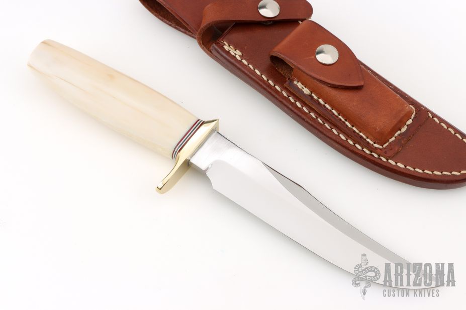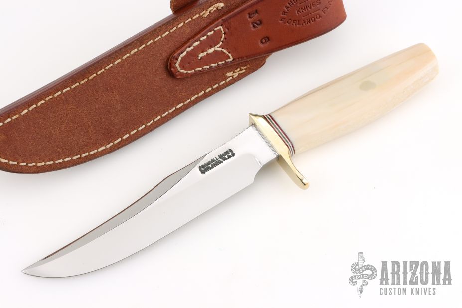 This Model 12-6 Little Bear Bowie by Randall Made Knives features a satin finished blade with notched thumbrest and sharpened top edge, .218" blade stock and 1.198" blade depth, hidden tang construction. The handle has a brass guard, fossil walrus ivory grip with red/white/blue spacers. Comes with a rough back brown leather sheath. Excellent condition. Comes with a Randall zippered case.