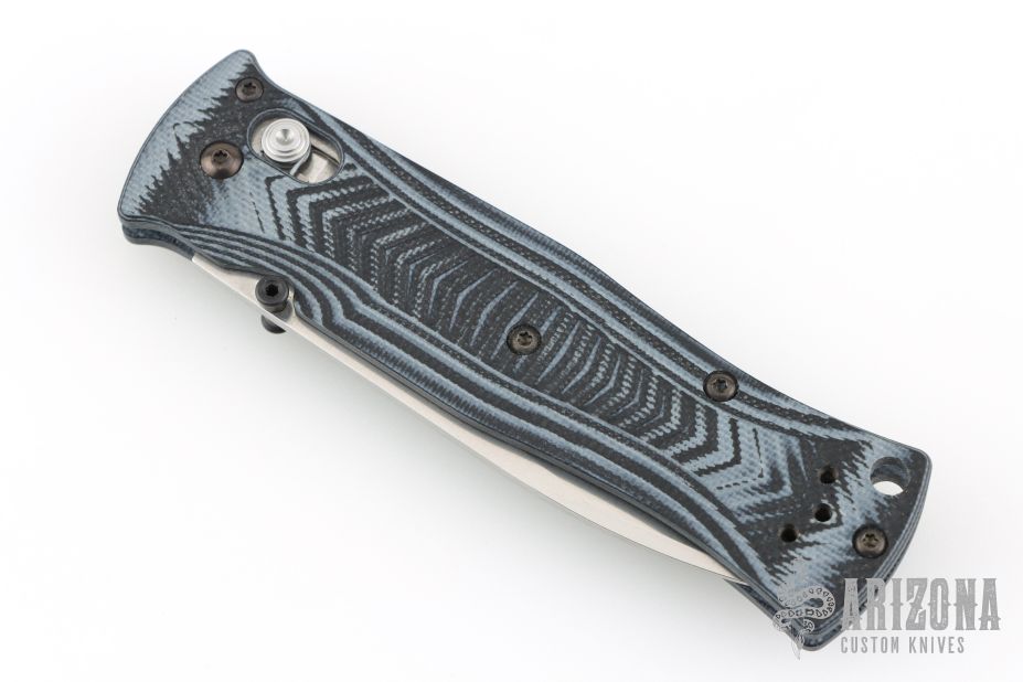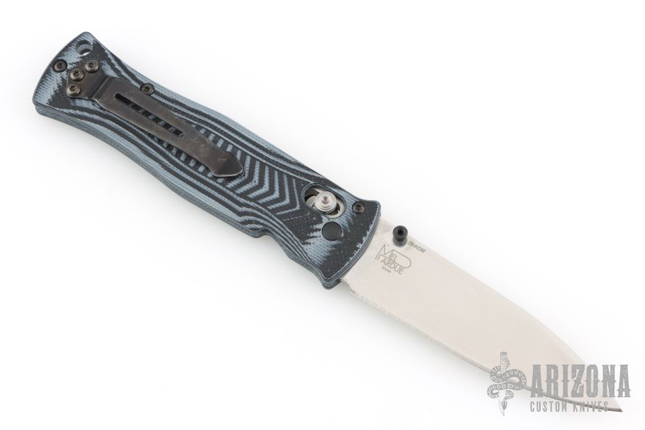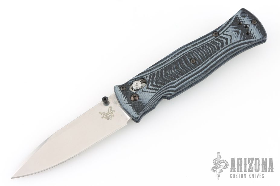 This Model 531 from Benchmade features a stonewashed spear point blade with swedge and dual thumb studs. The handle is comprised of black and gray G10 and stainless steel liners. Stainless steel reversible tip up clip. Lanyard hole in pommel. Comes with original box, pouch, and papers. Excellent condition.