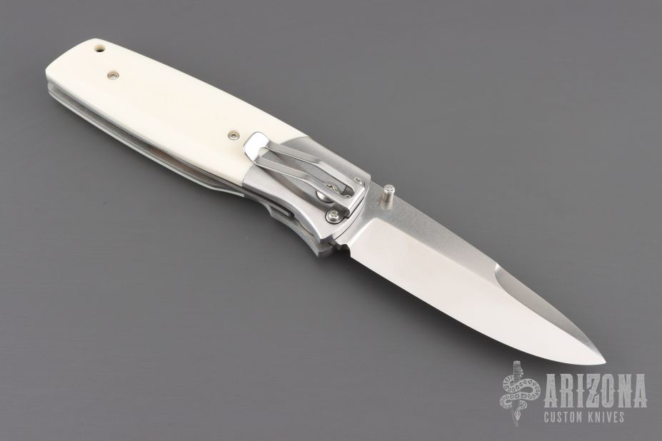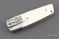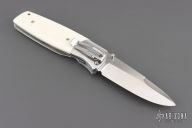This PXL by Fallkniven features a satin finished drop point 3G laminated steel blade with swedge and dual thumb studs. The handle is comprised steel bolsters and ivory paper micarta scales over steel liners and stand offs. Lanyard hole in pommel. Comes with original box. Excellent condition.