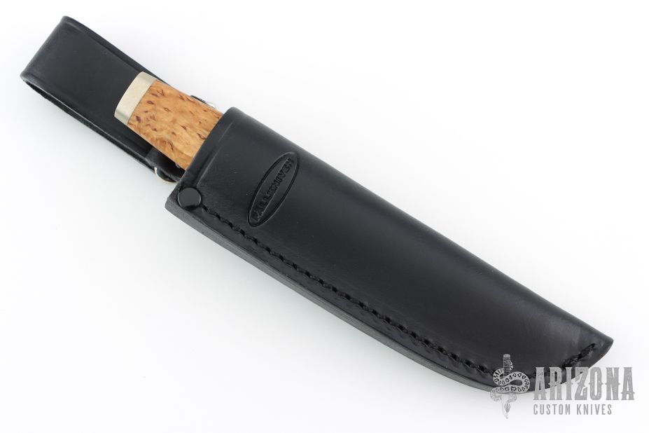 The SK3 by Fallkniven features a satin finished San Mai 3G blade with .116" blade stock and .702" blade depth, hidden tang construction. The handle has nickel silver guard and butt with wood grip. Comes with original box and black leather sheath. Excellent condition.