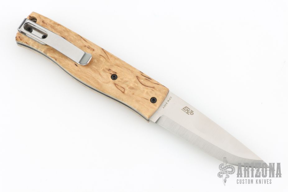 The PK-70 pocket knife is a non-locking folder from Brisa (EnZo) Knives of Finland. It features a beautiful curly birch wood handle with stainless liners and slipjoint mechanism. The blade is CPM-S30V stainless steel with a Scandi grind. Open via nail nick and carry with the deep tip-up pocket clip. The PK70 is an exceptional knife and legal in most places.