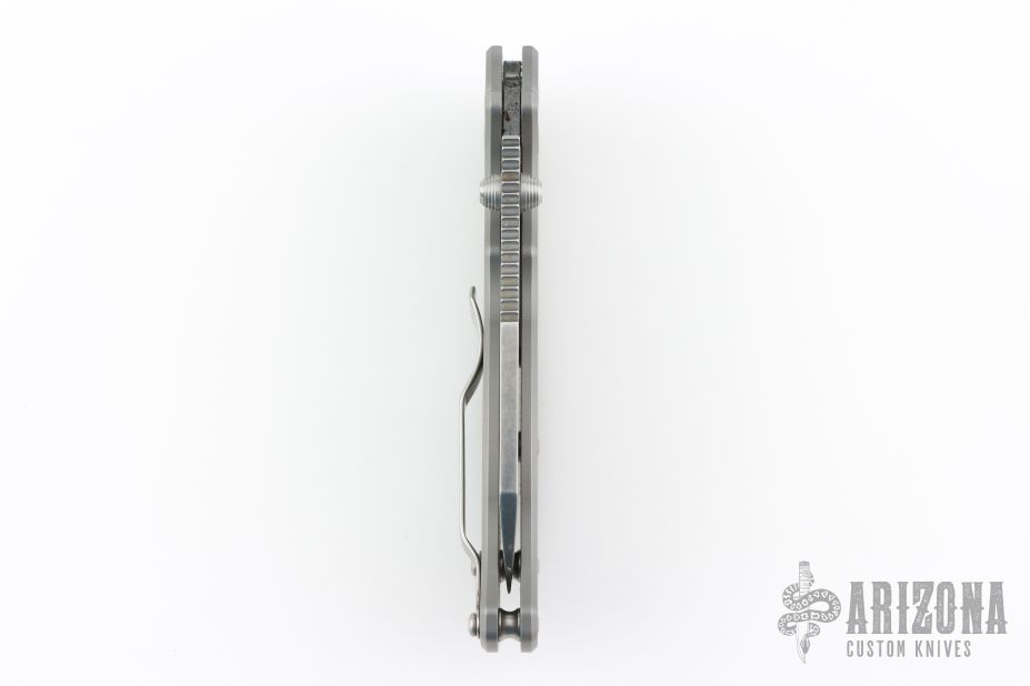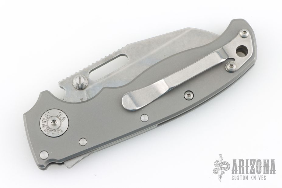 The AD20.5 by Demko Knives features the impressive Shark Lock and an even more impressive price point. The Shark Lock mechanism is situated on the spine of the knife and operated with a ramp-like ‘fin’, allowing you to flip the blade open and closed at will. It's probably the best thing about this knife and design, how quickly it can be deployed and ready for action. It acts as a blade launcher and a little wrist action is all it needs. This one has a stonewashed blade and bead blasted titanium handle. Has scuffs and scratches, great overall condition.
