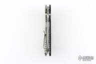 This XM-24 by Rick Hinderer features a stonewash finished blade with notched thumbrest and flipper. The handle has a stonewash finish titanium frame, black G-10 scale, satin titanium hardware, barrel spacers, and a tip up or down reversible titanium clip and filler tab, lanyard hole at the butt. Has some light scuffs, and is a little dirty, great overall condition.