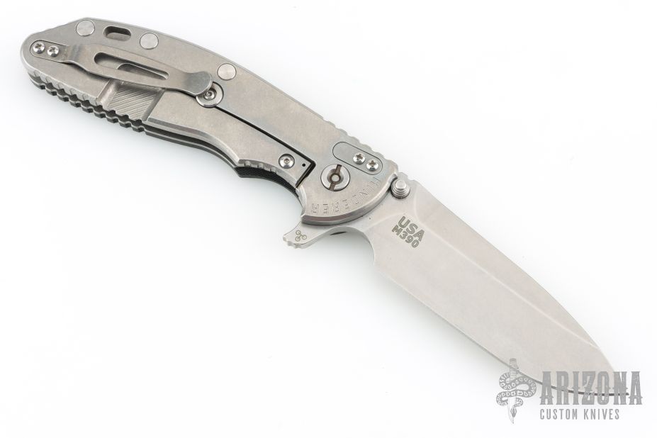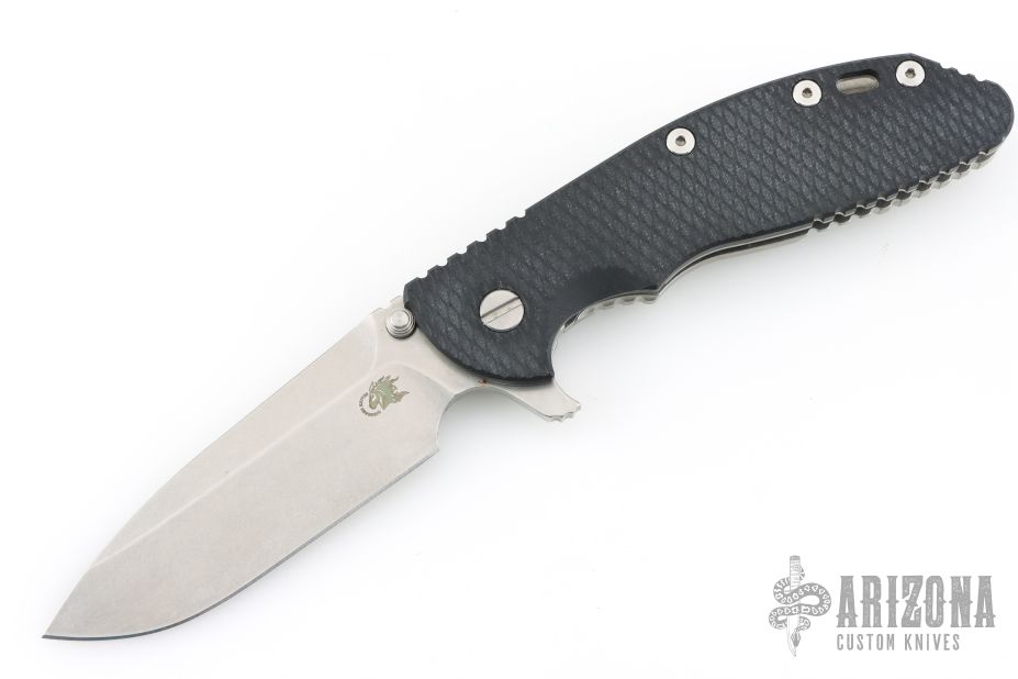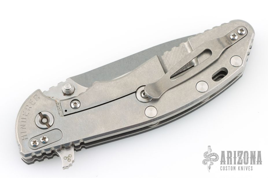 This XM-24 by Rick Hinderer features a stonewash finished blade with notched thumbrest and flipper. The handle has a stonewash finish titanium frame, black G-10 scale, satin titanium hardware, barrel spacers, and a tip up or down reversible titanium clip and filler tab, lanyard hole at the butt. Has some light scuffs, and is a little dirty, great overall condition.