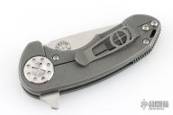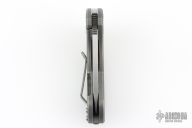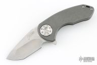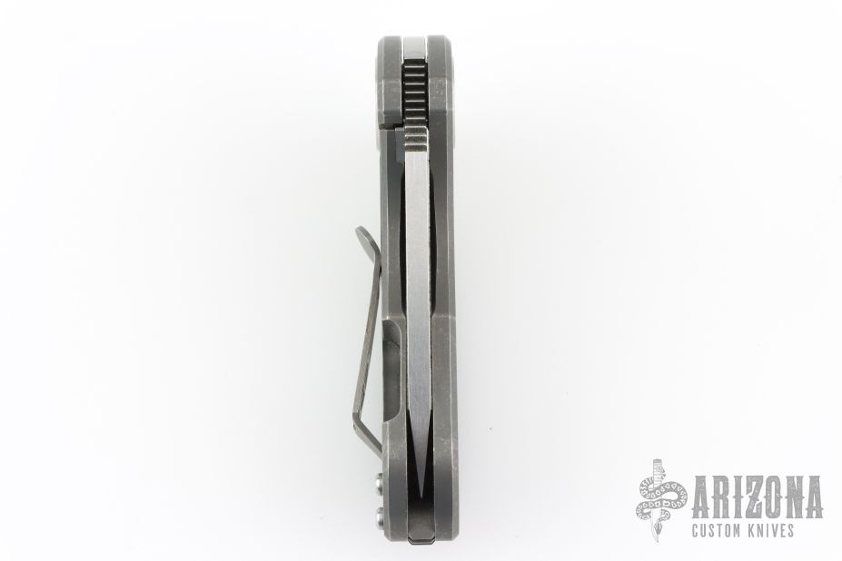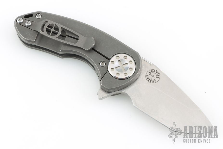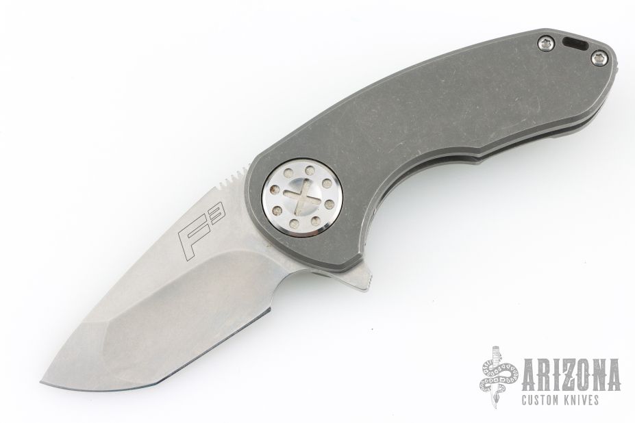 This compact F3 series flipper by Dave Curtiss features a tanto blade with flipper. Tumble finish titanium frame and pocket clip for tip up carry. Nice detent, lockup and blade seating. Rides on bearings. Has some scuffs and scratches, great condition otherwise.