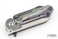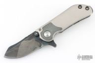 This Mini M8 Flipper by Direware Custom Knives features a Black Camo finished blade with swedge, notched thumbrest, and flipper. The handle has a satin finished titanium frame with dual etched Damasteel bolster inlays, hardened stainless steel backspacer and tip up white timascus clip. Nice blade seating, detent and lock up, rides on bearings. Has some scuffs, scratches, and been resharpened. Good condition otherwise.