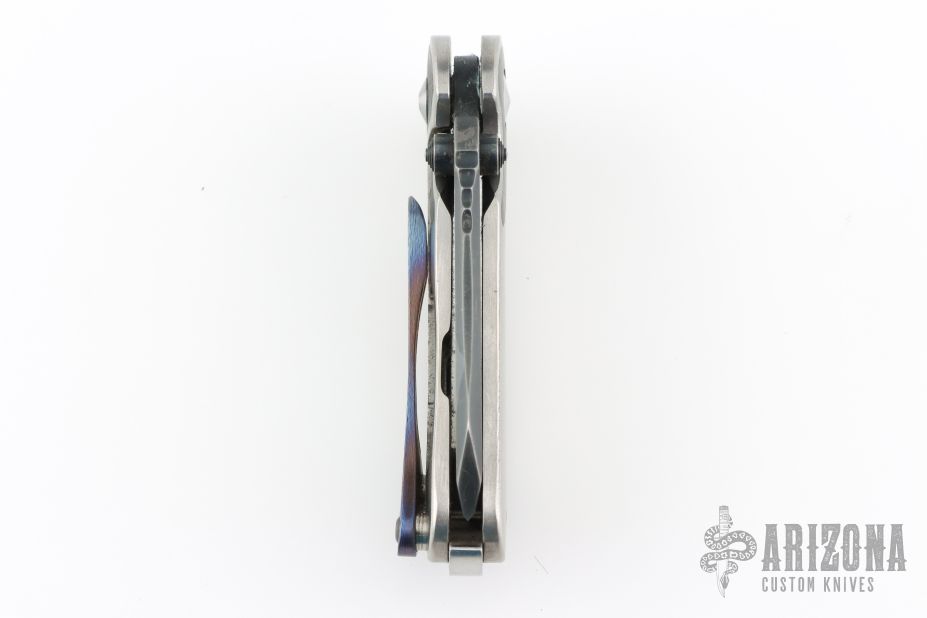 This Mini M8 Flipper by Direware Custom Knives features a Black Camo finished blade with swedge, notched thumbrest, and flipper. The handle has a satin finished titanium frame with dual etched Damasteel bolster inlays, hardened stainless steel backspacer and tip up white timascus clip. Nice blade seating, detent and lock up, rides on bearings. Has some scuffs, scratches, and been resharpened. Good condition otherwise.